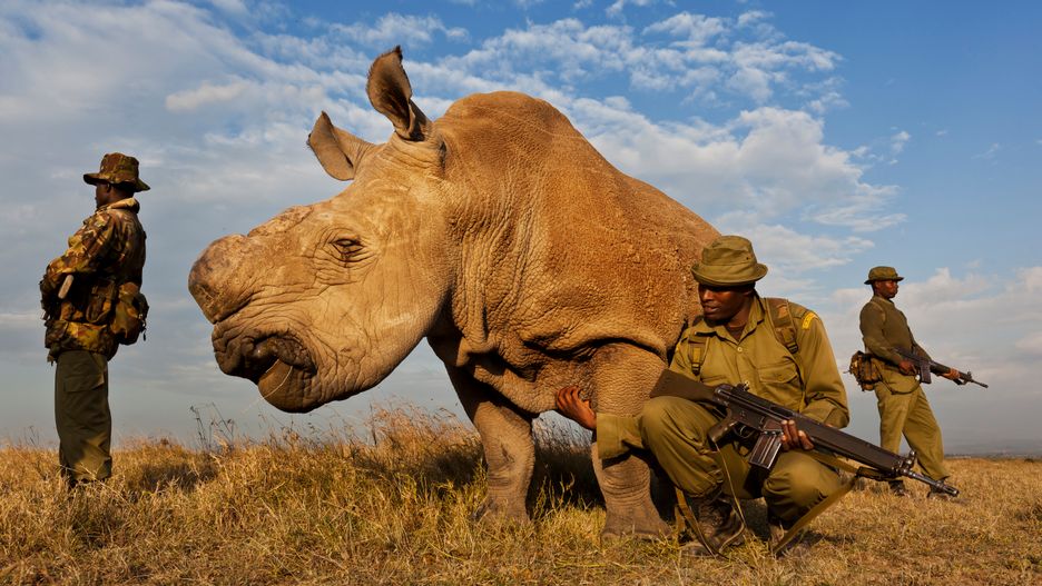 Źródło zdjęć: © © **Brent Stirton | EOS 5D Mark II | Rezerwat Ol Pejeta, Kenia (13 lipca 2011 r.) **. Zdjęcie Stirtona przedstawia jednego z ostatnich białych nosorożców północnych, który jest pod stałą opieką czterech wartowników. Zostało zrobione podczas śledztwa dot.