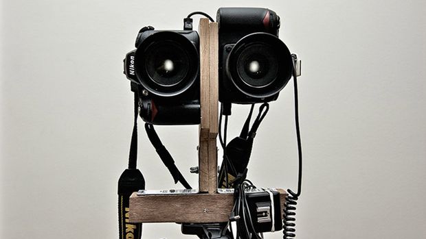 Zanim jednak dotarli do ostatecznego rozwiązania swojego problemu, długo głowili się jak zsynchronizować obydwa aparaty, oraz trzy lampy. Przede wszystkim jednak, należało ułożyć lustrzanki w odpowiedniej odległości i płaszczyźnie - tak, by odstęp między nimi odpowiadał przeciętnemu rozstawowi oczu. Zdecydowali się na dwa Nikony d90, w pionie przymocowali je spodami do siebie. Ponieważ na rynku nie ma głowic utrzymujących w ten sposób dwa aparaty, musieli wykonać ją sami.