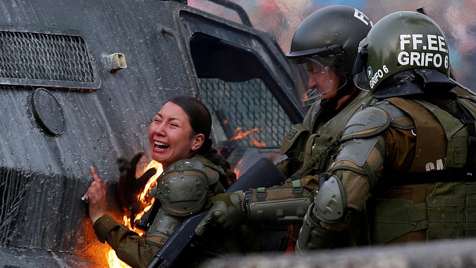 Jorge Silva relacjonował: "To popołudnie było intensywne - od czasu wykonania tego zdjęcia przez 3 godziny trwały nieustanne starcia tysięcy protestujących z policją. Stałem przy wejściu do stacji metra Baquedano, która była centrum protestów przez kilka tygodni. Policja przemieściła się szybko, by zając pozycję na rogu placu. Nie mogłem dłużej być w pierwszej linii protestujących, ponieważ uruchomiono działka wodne, więc musiałem przedrzeć się do tyłu w oparach gazu łzawiącego. Nagle po prawej stronie zobaczyłem rozbłysk i gdy się obróciłem pojawiła się płonąca policjantka i kilku innych funkcjonariuszy, którzy próbowali ją gasić. Wszystko trwało 5 sekund, ale widziałem to w zwolnionym tempie. Kobietę zabrano do wozu policyjnego, by ją opatrzyć. Tłum rzucający kamienie nas minął. Policja była wściekła, strzelali gumowymi kulami i pociskami z gazem jeszcze przez kilka godzin, aż do późnej nocy."