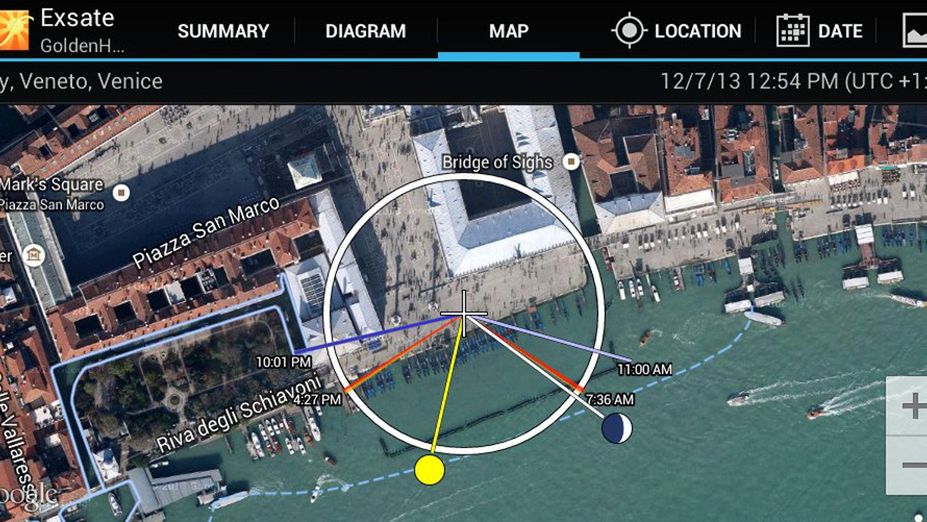 To program godny polecenia przede wszystkim dlatego, że w wersji na komputery stacjonarne jest bezpłatny. Zapłacić musimy tylko wtedy, gdy chcemy go używać na tablecie lub smartfonie. Aplikacja nie tylko określa godzinę wschodu i zachodu w dowolnym miejscu na świecie i dowolnego dnia, ale też uwzględnia różnicę w wysokości terenu. Jej działanie opiera się na mapach Google, na które naniesione są linie pokazujące azymut wschodu, azymut zachodu oraz kierunek padania promieni słonecznych o danej godzinie. Można też oczywiście dowiedzieć się, jak wysoko nad horyzontem będzie tarcza słońca o konkretnej godzinie.