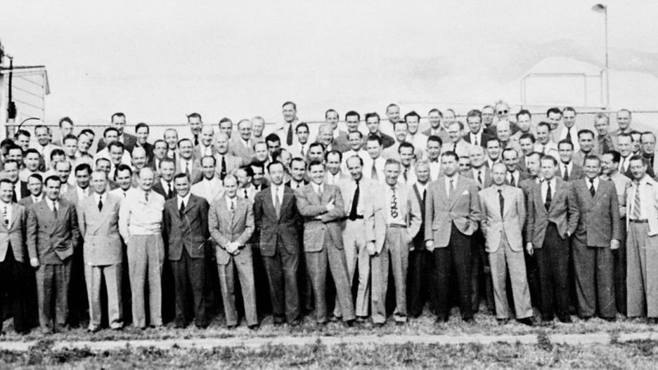 Na zdjęciu wykonanym w 1946 r. w Nowym Meksyku widać grupę 104 niemieckich naukowców, którzy wcześniej zajmowali się m.in. opracowywaniem rakiet V-2. Po wojnie dawni współpracownicy Hitlera zostali zwerbowani przez USA w ramach Operacji Paperclip (ang. spinacz).