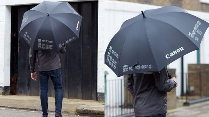 Najwyższe modele lustrzanek marki Canon są uszczelnione przed wilgocią, ale nie zagwarantują takiej ochrony przed deszczem, jak porządny parasol. 92-centymetrowy parasol Canona ochroni was i wasz sprzęt przed zmoknięciem. Aby każdy wiedział, że jesteście fanami Canona, dookoła czarnego parasola umieszczono białe logo oraz grafiki prezentujące ewolucję aparatów japońskiego producenta. Cena w przeliczeniu na złotówki: 125 zł.