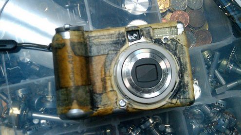 Czy ten kompakt Canona nie wygląda okropnie? Prezentuje się niczym aparat wyciągnięty ze śmietnika. Oby właśnie tak pomyślał potencjalny złodziej. Ten odrażający aparat to pomysł Jimmiego z portalu Flickr.com. Fotograf wykorzystał trochę starej taśmy papierowej oraz prawdopodobnie kilka farb, aby dodać efektów specjalnych brudu. Po co fotograf tak bardzo oszpecił swoją cyfrówkę?