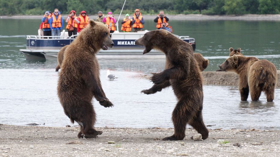 Z boku całemu zajściu oprócz fotografa przyglądały się młode oraz turyści, którzy akurat przepływali łodzią. To jeszcze bardziej podkreśliło komizm sytuacji. Wyglądało to, jakby niedźwiedzie przygotowały przedstawienie. Scena budzi też skojarzenie z ringiem, dookoła którego gromadzą się widzowie.