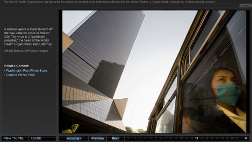 Dobrze ułożona i wyselekcjonowana galeria The Washington Post zawiera 24 wysokiej jakości fotografie. Fotoedytorzy amerykańskiej gazety wykorzystali kilka zdjęć, którymi posługują się niemal wszystkie media na świecie, jak np. fotografię pary całującej się w maskach ochronnych. Mimo to warto zajrzeć na www.washingtonpost.com, ponieważ zgromadzona tam kilkanaście interesujących kadrów dotyczących świńskiej epidemii.