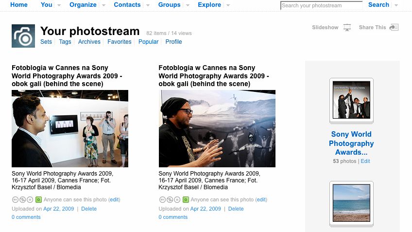 Fotoblogia była ostatnio w Cannes, a teraz zagościła na stałe na portalu Flickr.com. Dopiero startujemy i liczymy na wasze wsparcie. To miejsce dla Was - możecie tam umieszczać swoje zdjęcia inspirowane poradnikami z Fotoblogii lub po prostu swoje interesujące kadry. Jeśli udało Wam się w jakiś sposób zastosować rady z naszych tekstów to zapraszamy do podzielenia się efektami. Z pewnością inni czytelnicy na tym dodatkowo skorzystają. Póki co umieściłem na Flickrze zdjęcia z Sony World Photography Awards 2009, ale niedługo będziemy tam wrzucać również inne fotografie. Zapraszamy!