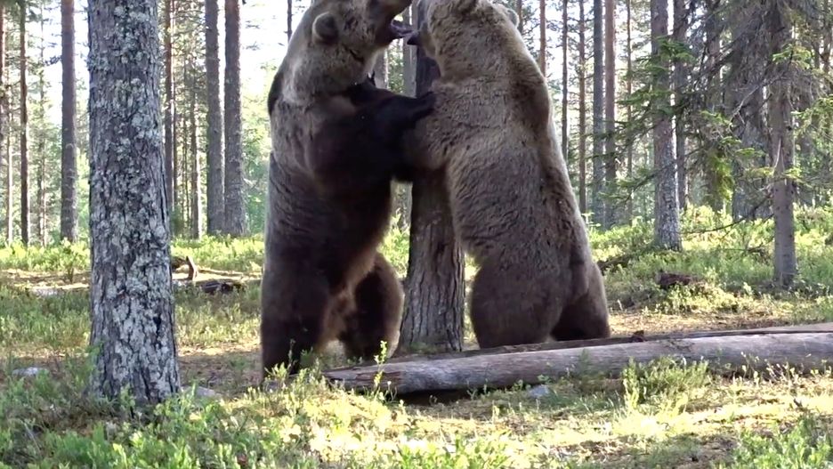 Tero Pylkkanen pojechał odpocząć na łonie natury. W lesie obok fińskiego miasta Kuhomo żyje wiele gatunków zwierząt, w tym oczywiście niedźwiedzie. Fotograf miał okazję podziwiać ich zwyczaje. Nie byłby sobą, gdyby nie zrobił filmu, pokazującego zawziętą walkę.