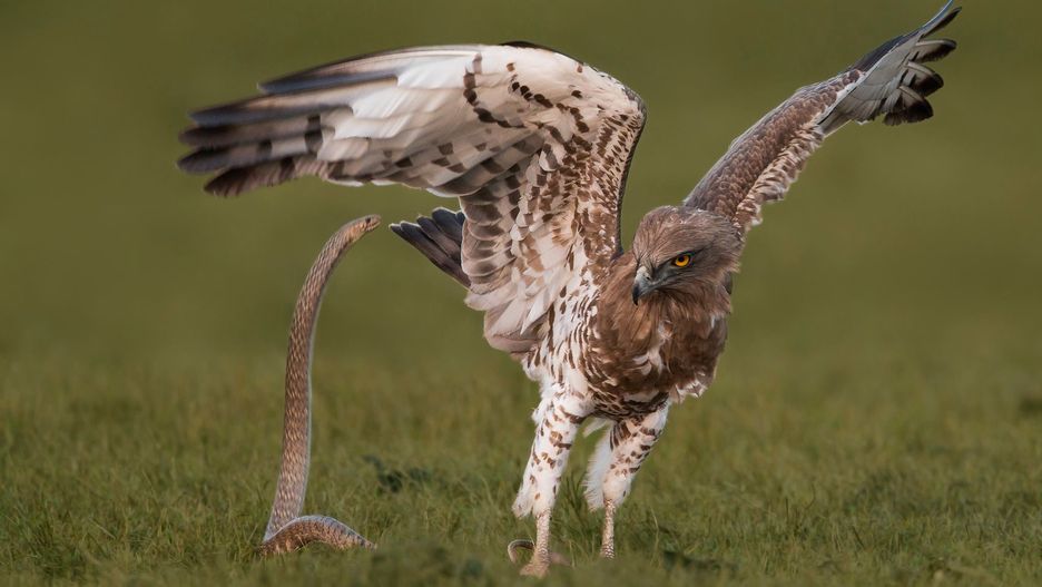 Zazwyczaj te drapieżne ptaki zabijają węże uderzając je w głowę i wbijając szpony w ich ciało. Po wygranej bitwie zjadają swoje ofiary w całości, co często kończy się dość nietypowym widokiem, który udało się uchwycić Sambathowi. Z dzioba ptaka wystaje końcówka ogona węża, kiedy jego głowa jest już trawiona w żołądku ptaka.