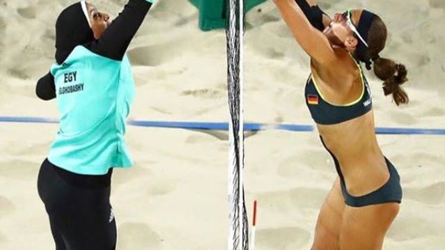 Mecz siatkówki plażowej wygrała reprezentacja Niemiec, pokonując Egipt 2:0 w setach. Jak sama nazwa dyscypliny wskazuje – nosi się na niej stroje plażowe. Na boisku pojawiła się reprezentacje Niemiec – Kira Walkenhorst i Laura Ludwig w strojach sportowo-plażowych, znanych w naszej kulturze czyli bikini. Dodatkowo siatkarki miały spięte włosy i okulary przeciwsłoneczne.