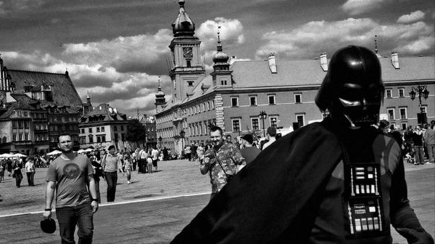 Nie umawiałem się w Warszawie z Darthem Vaderem. Idąc Krakowskim Przedmieściem oczekiwałem raczej kwiaciarek i ulicznych grajków. Prędzej spodziewałem się spotkać tam lajkonika, niż bohatera Gwiezdnych Wojen. Mr. Vader, kimkolwiek był, zostawił mi na reakcję ułamek sekundy. Złowieszczo przechyliłem horyzont, czarną postać umieściłem w mocnym punkcie kadru i pstryk. Potem zdjęcie czekało cierpliwie w cyfrowej szufladzie na swoje pięć minut. Jego czas właśnie nadszedł. Wydarzenia ostatnich dni wskazują, że życie jest bardziej niż kiedyś kosmiczne, a świat zsuwa się po równi pochyłej. Kadr pozostał ten sam, ale kontekst jest bardziej science-fiction. To nadaje temu zdjęciu nowego znaczenia. Budzi we mnie strach, niekonieczne obwieszczając to wszem i wobec.