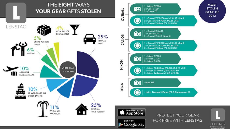 Na podstawie raportów zgłoszeń kradzieży Lenstag opracował infografikę z danymi na temat miejsc i sytuacji, w których dochodzi do kradzieży, oraz najczęściej kradzionego sprzętu.