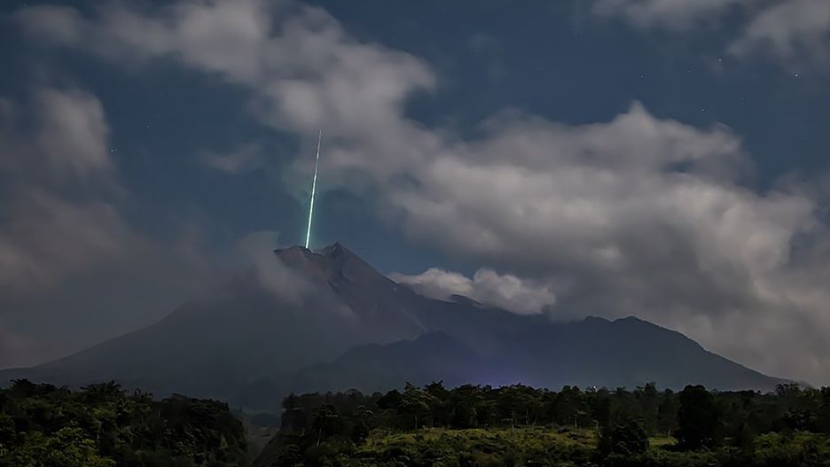 Guanarto Song postanowił sfotografować aktywny wulkan pod koniec maja 2021 roku Na jego zdjęciu krajobrazowym udało się uchwycić "spadającą gwiazdę", którą jest meteoryt. Wskazuje na to niebiesko-zielony ślad na niebie, który powstaje wskutek spalania magnezu.