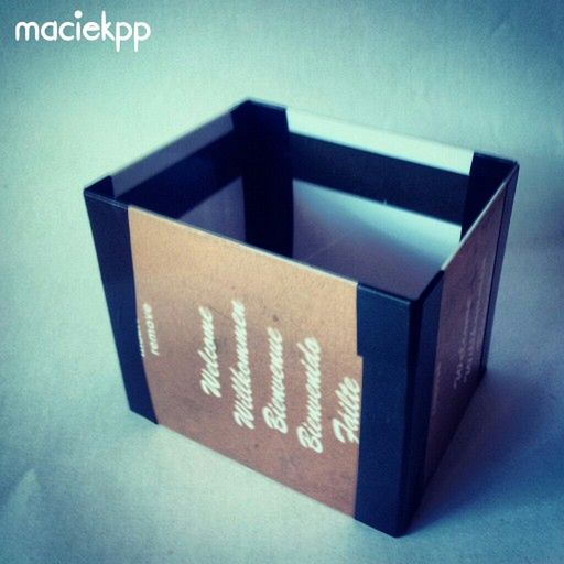Karty przycinamy tak, aby ich krawędzie odpowiadały długości boków wyświetlacza, a następnie sklejamy taśmą w środku i w miejscach złączeń. Następnie w krótszych ściankach pudełka robimy dwa otwory, przez które przeciągamy elastyczną gumkę – robimy uchwyt, przez który osłona będzie przymocowana do body. Całość możemy dodatkowo okleić taśmą.