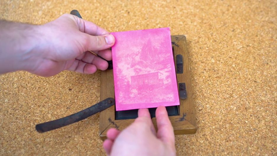Mathieu wykorzystał suk z buraka, ale bez problemu można wykorzystać przykładowo sok z wiśni czy innych mocno barwiących owoców. Na papier akwarelowy naniósł po sobie 3 warstwy soku, zostawiając każdą z nich do wyschnięcia. Czas naświetlania odbitki wynosił aż 7 dni. Zasada naświetlania jest typowo negatywowa – ciemne partie naszej folii zostaną zastąpione barwnikiem, a jasne wypalone przez słońce.