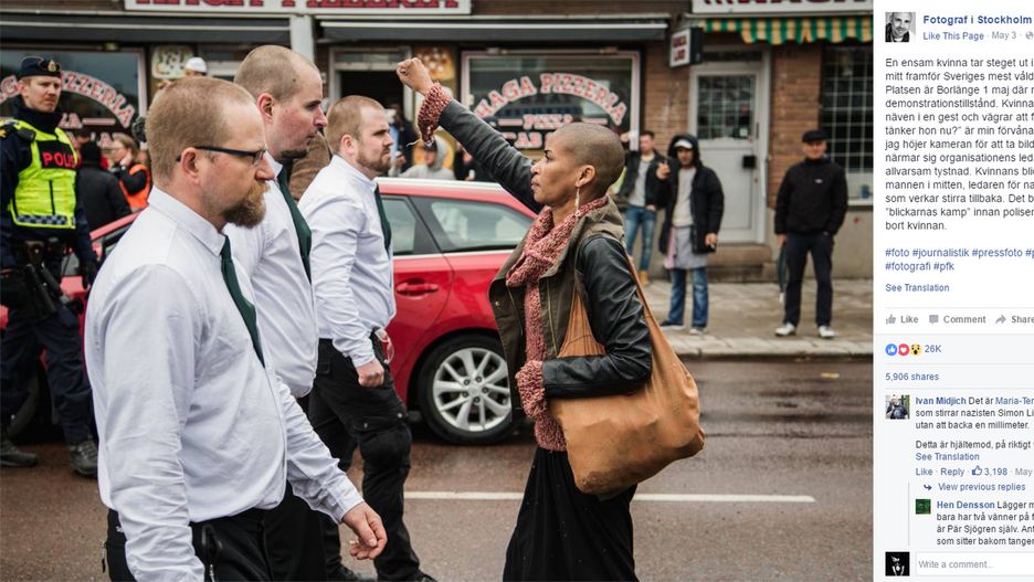 To zdjęcie zdobyło rozgłos w całej Szwecji. Czarnoskóra kobieta wystąpiła przeciwko 300 neonazistom z Nordyckiego Ruchu Oporu podczas ich przemarszu. Aktywistka była na miejscu dopóki nie usunęła jej policja.
