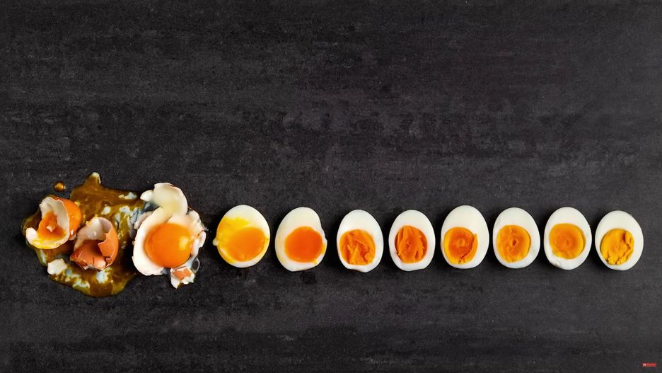 Do gotującej się wody wstaw kilka jajek. Wyciągaj je po sobie w przerwie około 1 minuty od wstawienia. Nie pomyl kolejności! Każde z jajek będzie miało białko i żółtko ścięte inaczej. Rozbijając skorupki i układając jajka w odpowiedni sposób pokażesz zmianę ich wewnętrznej struktury.