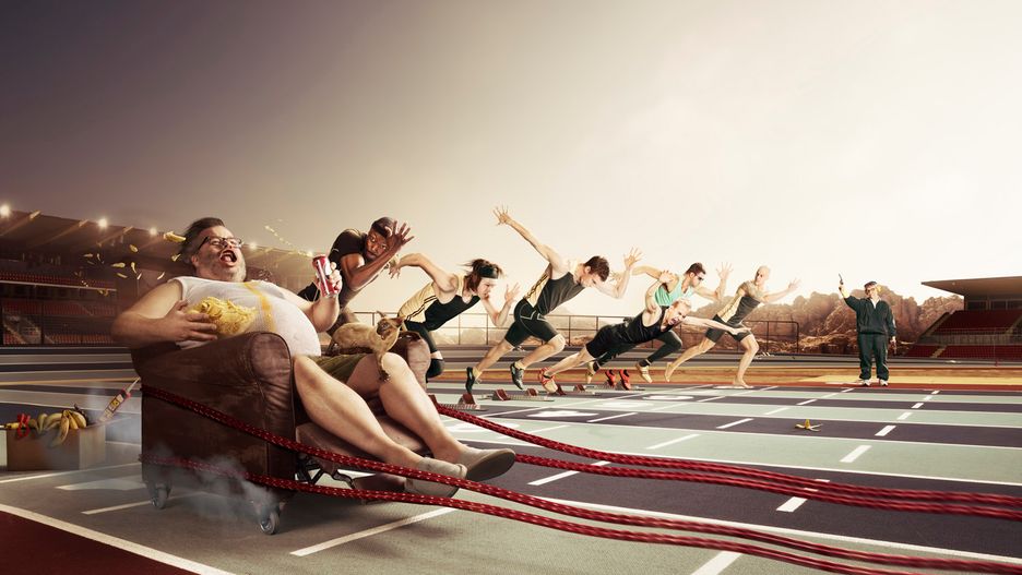 ”Zachłanny gość” zbudował dla siebie fotel z katapultą, by szybko osiągnąć to, na co sportowcy pracują przez lata. Zastawił również liczne pułapki: skórkę od banana na drodze jednego z biegaczy, innemu przykleił buty do bloku startowego. Oszustwo jest jego domeną i nie zawaha się przed niczym, by osiągnąć sukces.