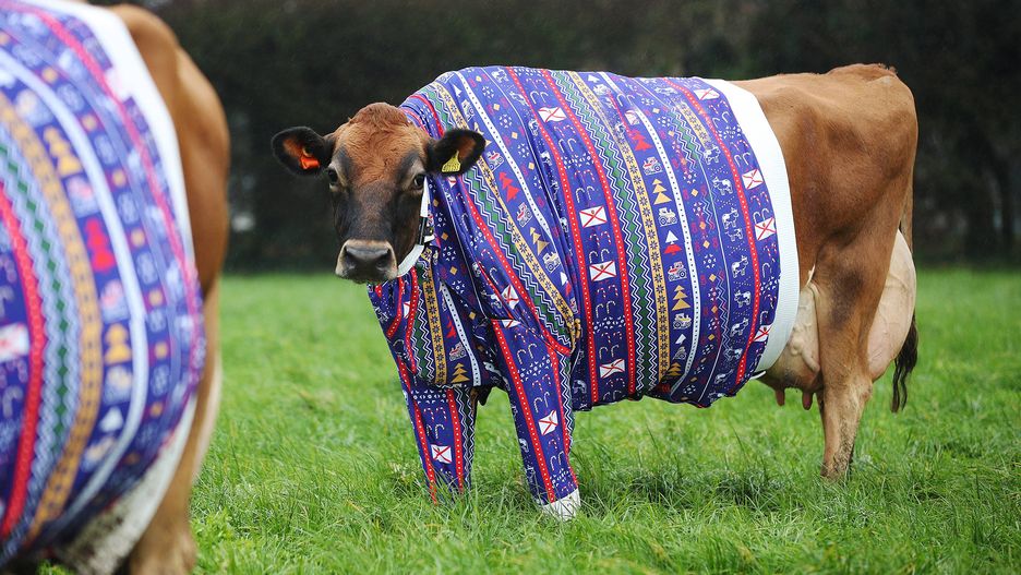Becky Houze jest farmerką z Jersey, która kocha swoje krowy. Z okazji Świąt Bożego Narodzenia postanowiłą ubrać je w ogromne fioletowe swetry z kolorowymi wzorkami. Dlaczego? Ponieważ chciała rozweselić odwiedzających oraz sprawić, by zwierzakom było trochę cieplej.