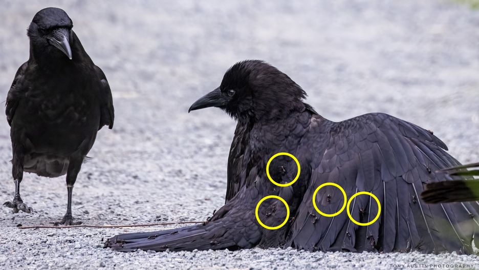 Tony Austin wybrał się na spacer, by zrobić kilka zdjęć. Po jakimś czasie zauważył stado kruków, które wylądowało nieopodal. Zaobserwował wśród nich dziwne zachowanie. Jeden z ptaków był cały pokryty mrówkami i trzepotał skrzydłami.
