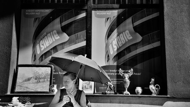 Aparat do ręki. Na aparat obiektyw 35 mm. Jeśli takiego nie macie, nie szkodzi. Na zwykłym zoomie można ustawić odpowiednią ogniskową i potem jej nie zmieniać. Jeśli nie mamy w głowie żadnego pomysłu, a nie mamy skoro jesteśmy w czarnej dziurze, to najlepiej wyjść z domu. Wejść w tę ulicę, którą nigdy nie przechodzimy, bo zawsze jest nie po drodze i poszukać jakiegoś kadru, tak na rozgrzewkę. Nawet bez zwalniania spustu migawki. Prędzej, czy później znajdujemy coś wartego uwiecznienia.