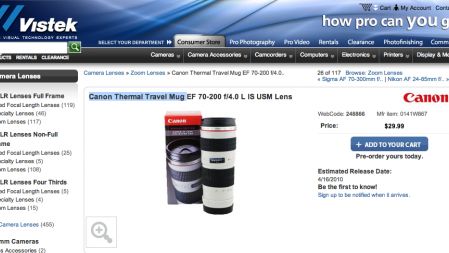Przez ostatnie dni Internet opanowała mania genialnych zamykanych kubków wyglądających, jak słynne szare obiektywy z serii ?L? Canona. Gadżet był rozdawany na Zimowej Olimpiadzie w Kanadzie przez lokalny oddział Canona. 8 marca pisaliśmy, że pewien fotograf z Kanady kupił 2 egzemplarze kubków w lokalnym sklepie. Przedstawiciele sklepu twierdzili, że szary termos trafi niebawem do sklepów. Nie pomylili się.