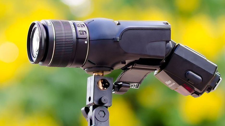 Konstrukcja Light Blaster składa się z mocowania na lampę systemową, ramki na dedykowane slajdy/gobo i bagnetu na obiektyw Canona. Żeby podłączyć obiektyw Nikona, trzeba dokupić specjalny adapter.