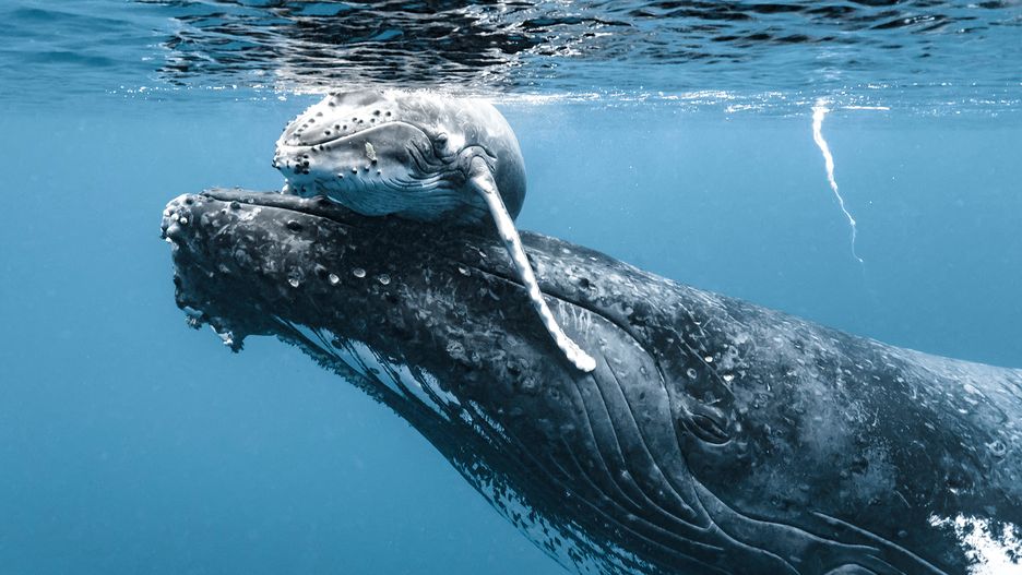 Scena ujęta w okolicy Vava'u, na wodach Królestwa Tonga (Polinezja) pokazuje, jak mały wieloryb podpływa i opada delikatnie na głowę matki. Ta wypycha go ku górze, by uczył się regularnie nabierać powietrza. Dzięki temu, będzie mógł w przyszłości odbywać długie sesje nurkowania i doskonale będzie wiedział, kiedy się wynurzyć i wziąć oddech.