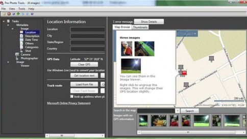 Jeśli zdjęcie ma zapisaną już szerokość i długość geograficzną, to Pro Photo Tools pozwoli na wyświetlenie ich lokalizacji na mapie. Jeśli aparat nie wpisał tych danych, wystarczy kliknąć na mapę, aby wskazać gdzie zdjęcie zostało zrobione. Program korzysta oczywiście z microsoftowego Virtual Earth do prezentacji mapy.