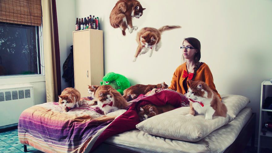 Zmultiplikowane koty i ich właściciele to temat cyklu Andréanne Lupien pt. „Cat lovers and their cats". 23-letnia fotograf z Quebecu chciała zrobić ciekawą serię zdjęć, a inspiracją do niej stał się autoportret ze swoim kotem.