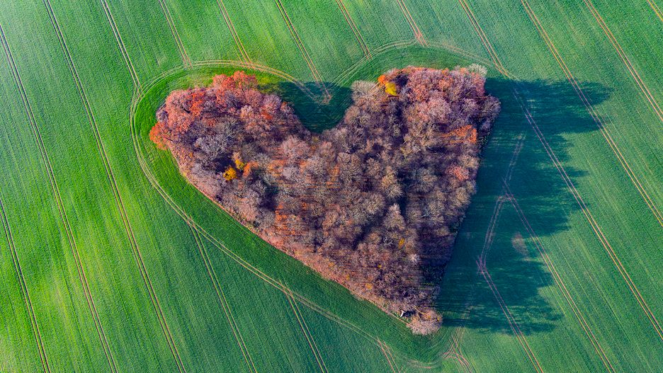 Drzewa są ułożone tak, że z wysokości tworzą kształt serca. Dookoła nich obecnie są pola rzepaku, które w okolicach maja przybierają intensywnie żółty kolor. Teraz, jesienią, lasek otaczają piękne zielenie, które sfotografował Robert Neumann z agencji FORUM z drona.
