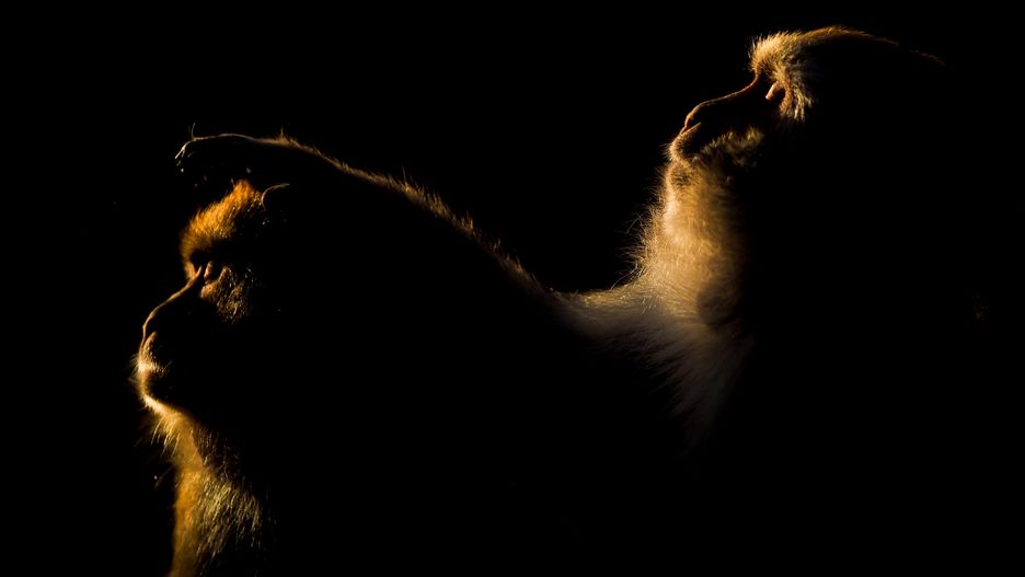 Stwierdziłem, że jedyna opcja to wykorzystanie ostrego kontrastowego światła i ukrycie całego zaśmieconego tła w czerni. Warunki oświetleniowe wbrew pozorom temu sprzyjały – zdecydowałem się na sfotografowanie sceny centralnie pod światło, tak aby zdjęcie miało jak najbardziej graficzny charakter. Postanowiłem je tak mocno niedoświetlić, żeby stracić wszelkie szczegóły w cieniach i pozwolić jedynie na zarejestrowanie małego fragmentu tego na co patrzyłem, czyli konturu małp, jaki tworzyło ich podświetlone futro.