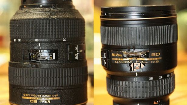 Zniszczone obiektywy - oto do czego może doprowadzić kłótnia z dziewczyną. Pod młotek (nie chodzi o aukcję!) poszły obiektywy Nikon 17-35mm f/2.8 D, Nikon 80-200mm f/2.8 D, Nikon 28-70mm f/2.8 D, Tokina 28-70mm f/2.6 – 2.8 i telekonwerter TC-20E.