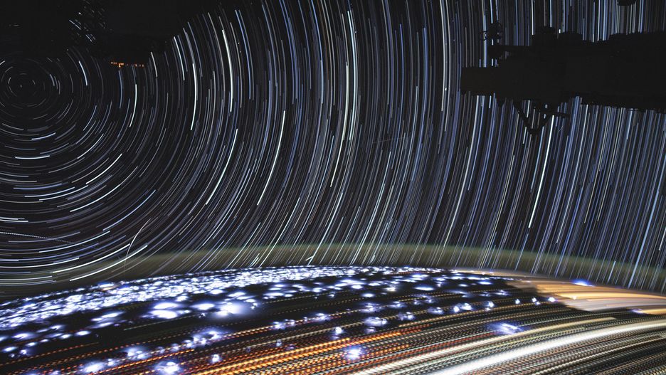 Zdjęcie autorstwa Christine Koch z NASA to połączenie 400 pojedynczych klatek, które świetnie pokazują ruch gwiazd oraz świateł na Ziemi. Widać nawet poświatę naszej atmosfery!