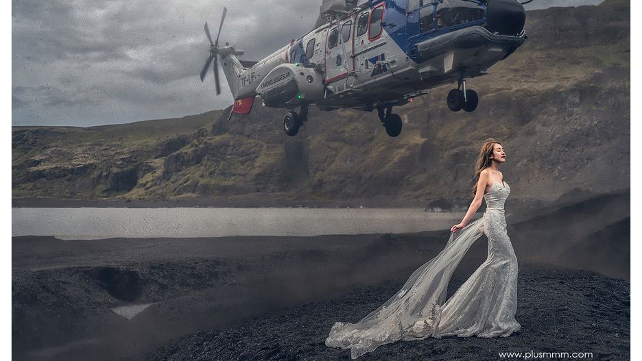 To zdjęcie, zrobione na Islandii, nie jest sklejką. CM Leung sfotografował pannę młodą na tle lecącego helikoptera ratunkowego. Trzeba przyznać – dziewczyna jest odważna – stała nieporuszona do momentu, w którym nie minął ją helikopter.
