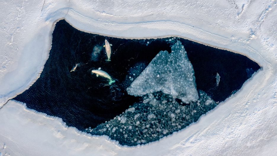 Fotoreporter zarejestrował zdjęcia przy latarni morskiej Tokarewskiego w okolicy Władywostoku (Rosja), gdzie wśród zamarzniętej wody powstała wyrwa. Wizualnie odznacza się ona ciemniejszym kolorem przez widoczną głęboką wodę. Dookoła zaobserwujemy jasny lód i śnieg, a w centrum jasne foki i białuchy. Te obrazu kompozycyjna uczta dla każdego miłośnika fotografii dzikiej przyrody oraz zdjęć z dronów.