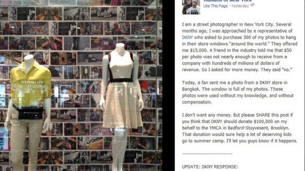 Znana firma odzieżowa DKNY zaproponowała Brandonowi Stantonowi – autorowi popularnego blogu street photo Humans of New York – wykorzystanie jego zdjęć w wiosennej kampanii marki (dokładnie chodziło o kwotę 15 tys. dolarów za 300 zdjęć, którą autor uznał za niewystarczającą jak na tak dużego klienta). Stanton odmówił, ale dla DKNY nie miało to większego znaczenia, ponieważ wspomniane 300 zdjęć jego autorstwa i tak stało się częścią dekoracji witryn sklepowych. Być może firma liczyła na to, że sprawa rozejdzie się po kościach i nikt nic nie zauważy, ale prawdopodobnie nie wzięła pod uwagę tego, że dzięki mediom społecznościowym szydło o wiele szybciej i częściej wychodzi z worka.