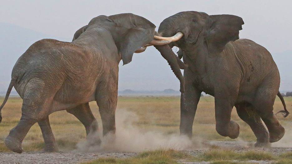 Niesamowite zdjęcia przedstawiają dwa słonie zaangażowane w walkę, której celem jest pokazanie swojej dominacji nad przeciwnikiem. Fotografowie wykonali zdjęcia w Parku Narodowym Amboseli w Kenii. Jak sami przekazali, było to bardzo imponujące móc zobaczyć siłę tych zwierząt, szczególnie, że dwa sfotografowane okazy są jednymi z największych słoni w parku.