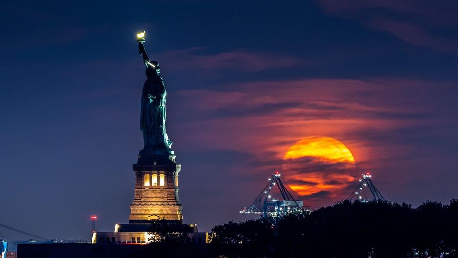 Dan Martland uchwycił pełnię Supermoon w pobliżu Statui Wolności za pomocą aparatu Sony Alpha 1.