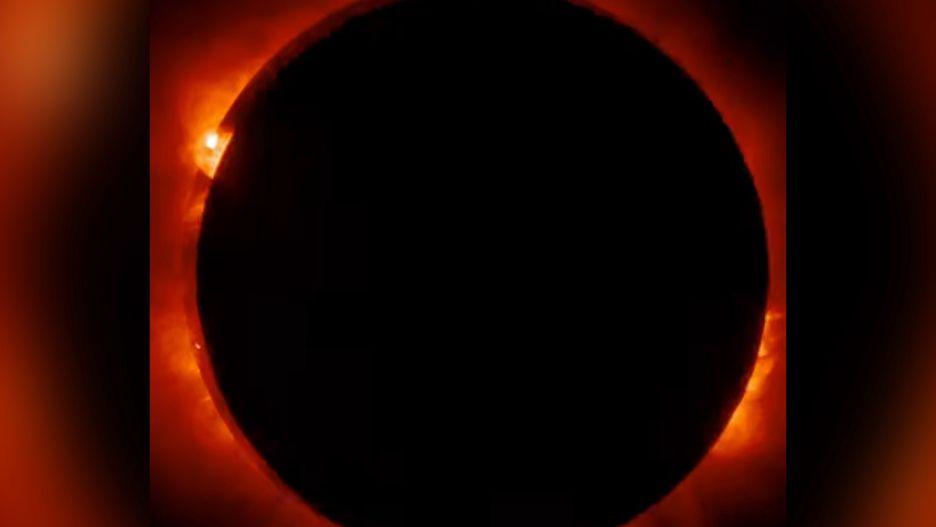 Zaćmienie widziane z kosmosu znacznie różni się od tego, co mogliśmy obserwować z Ziemi. Satelita, przelatując pod odpowiednim kątem, ukazała pełne zaćmienie Słońca. Wówczas tarcza Księżyca kompletnie nachodzi na gwiazdę, a zamiast rozżarzonego koła widać zaledwie ognisty pierścień (ang. "Ring of fire").
