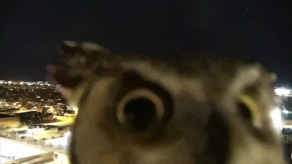 W tym przypadku mamy do czynienia z kamerą pogodową stacji telewizyjnej KRTV w Great Falls w stanie Montana (USA). Przed obiektywem pojawił się niespodziewany gość, a jest nim ciekawska sowa, która patrzy się idealnie w szklane oko soczewek. Właściciele kamery wspominają, żę takie rzeczy dzieją się dość rzadko i przeważnie mają do czynienia z pająkiem lub ćmą. Ptaki bywają gośćmi bardziej okazjonalnie.