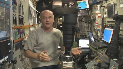 Amerykański astronauta Jeff Williams wykorzystuje Nikona D2X z potężnym Nikkorem 800 mm, jako akcelerometr podczas korygowania położenia stacji 24 stycznia 2010 r.Aparat wskazuje, że stacja się porusza i wskazuje w którym kierunku. Niesamowite zjawisko. W pobliżu dostrzegamy też prawdopodobnie Nikona D2X z jeszcze większym Nikkorem 1200 mm.