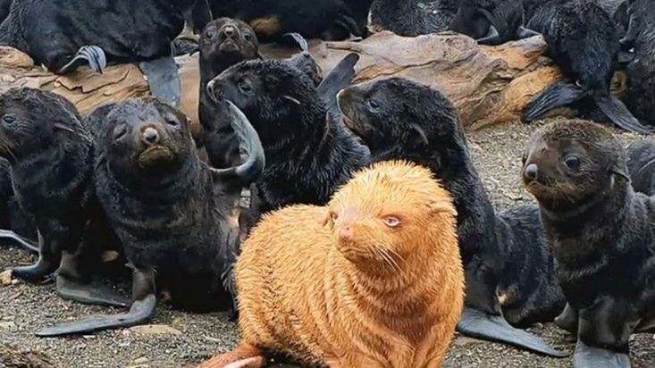 Ruda uchatka (podrodzina fok) od razu rzuca się w oczy na tle pozostałych, ciemnoszarych członków kolonii zamieszkującej u wybrzeży Morza Ochockiego. Zwierzę ma nie tylko rude futro, ale też różowe płetwy i błękitne oczy.