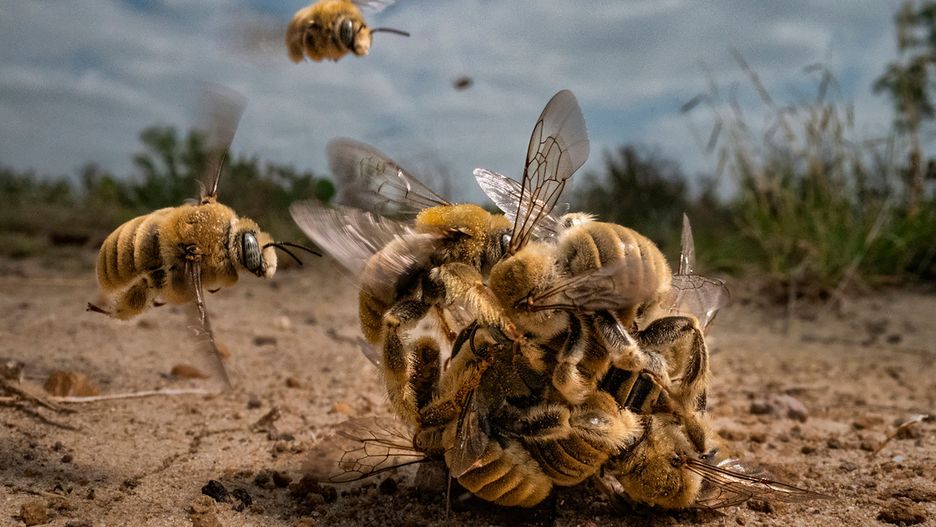 Pierwsze miejsce w konkursie zajęła Karine Aigner, która zaprezentowała niezwykły kadr (na górze artykułu). Zbliżenie na kulę pszczół to wyjątkowy widok. Fotografka dostrzegła sytuację w Texasie, a przedstawia ona gatunek pszczół żyjących na co dzień samotnie i jednoczących się jedynie na potrzeby rozmnażania. Ich zaloty mają miejsce na rozgrzanej ziemi. Pszczele gody trwają jedynie tydzień, więc trafienie na ten okres jest jeszcze trudniejsze.
