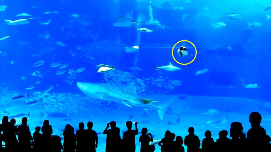Na filmie zobaczymy kilka błyśnięć flashem tuż przed ogromnym zbiorem dzikich ryb. Wśród nich były rekiny wielorybie oraz tuńczyki. W pewnym momencie widać, jak spory tuńczyk uderza głową prosto w szybę, sprowokowany do ataku błyskiem lampy. Ryba zginęła na miejscu. Biorąc pod uwagę, że tuńczyki są jednymi z najszybszych ryb i potrafią pływać z prędkością ponad 70 km/h, zwierzę nie miało szans na przeżycie.