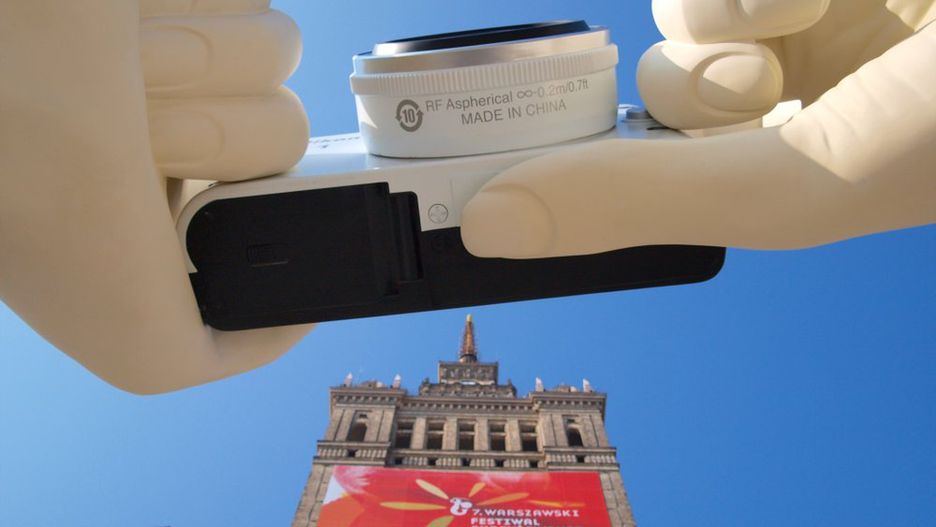 Konferencja rozpoczynała się około godziny 11, jednak dzięki nieco wcześniejszemu przybyciu miałem okazję zobaczyć krzątaninę przedprezentacyjną. Aparaty stały już na podestach, przykryte czarną, prześwitującą tkaniną. Było to o tyle interesujące, że przed PKiN-em od rana stała znana Wam już rzeźba rąk z osadzoną w nich dość wierną repliką modelu 1 J1 ;)