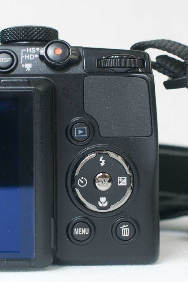 Z tyłu króluje duży, 3-calowy, odchylany wyświetlacz. Nad nim znajdują się: wizjer elektroniczny z korekcją dioptrii, (0.24 cale, 230 000 punktów), 2 przyciski do zarządzania wyświetlaniem ekranu i wizjera oraz przycisk do nagrywania filmów, którym można też wybrać tryb HD lub High Speed. Niżej ulokowano przycisk uruchamiający podgląd zdjęć, uniwersalny wybierak oraz - na samym dole - dwa okrągłe przyciski Menu i Delete. Nie można też zapomnieć o pokrętle sterującym w prawym górnym rogu.