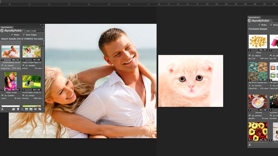Dzięki wtyczce Depositphotos można korzystać z wielu funkcji wyszukiwania zdjęć dostępnych w kolekcji agencji. Nie wychodząc z edytora zdjęć, możemy zalogować się do microstocka i zakupić wybrane zdjęcie. Przed zakupem możliwa jest ocena jego przydatności; wystarczy przenieść prewkę w obszar roboczy otwartego projektu.
