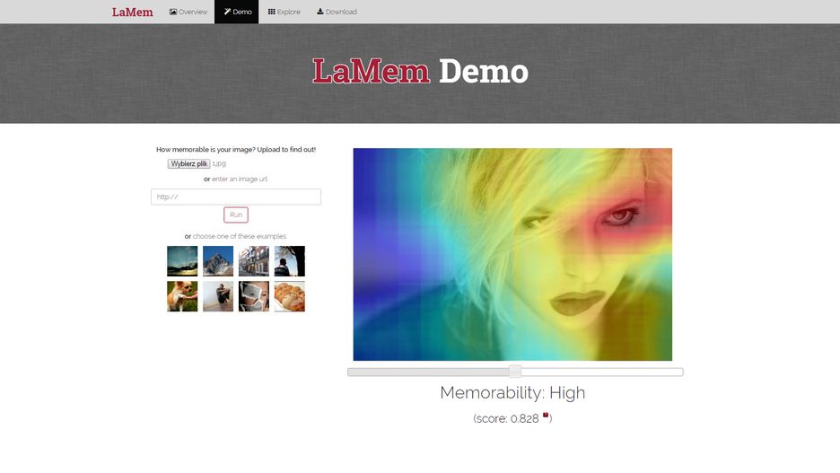 Przyjrzyjmy się jak w praktyce działa algorytm MIT. Ośrodek oferuje bezpłatne demo algorytmu na stronie internetowej. Po wgraniu fotografii program analizuje obraz i podaje wynik, który waha się w przedziale 0-1. Im wynik jest bliższy 1, tym bardziej nasza fotografia jest podatna na zapamiętywanie. Oprócz tego pojawia się filtr na wzór mapy termicznej pokazujący najmocniejszy punkt obrazu.