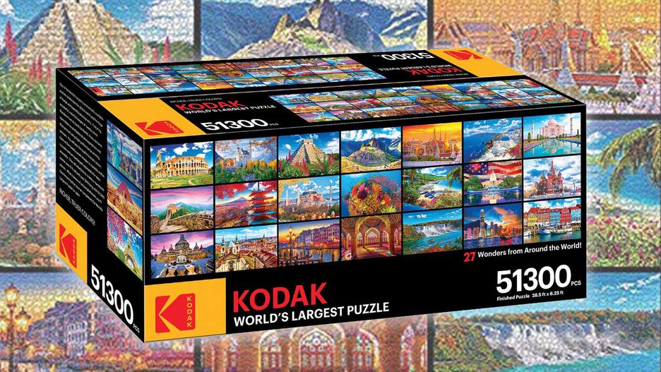Okazuje się jednak, że Kodak może również kojarzyć się z puzzlami. Firma stworzyła właśnie największą układankę na świecie dostępną w sklepie. Zapakowane w pudełko, które przypomina trochę to po filmie Kodaka, puzzle składają się z ponad 50 tysięcy elementów. Obrazek, jaki powstanie po ich ułożeniu, zbudowany jest z 27 mniejszych zdjęć, a każde z nich złożone jest z 1900 elementów. Zdjęcia wykonane zostały przez profesjonalnych fotografów, w różnych miejscach na świecie. Znajdziecie tam fotografie włoskiego Koloseum, Machu Picchu, greckiego Santorini czy Wielkiego Muru Chińskiego.