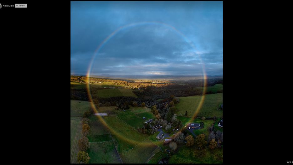 Nick mówi, że krople wody załamujące światło tak, by powstała okrągła tęcza, można przeważnie podziwiać z samolotu lub z bardzo wysokiego budynku. W internecie jest naprawdę mało zdjęć tego zjawiska, więc każde nowe wzbudza ogromną ekscytację odbiorców.